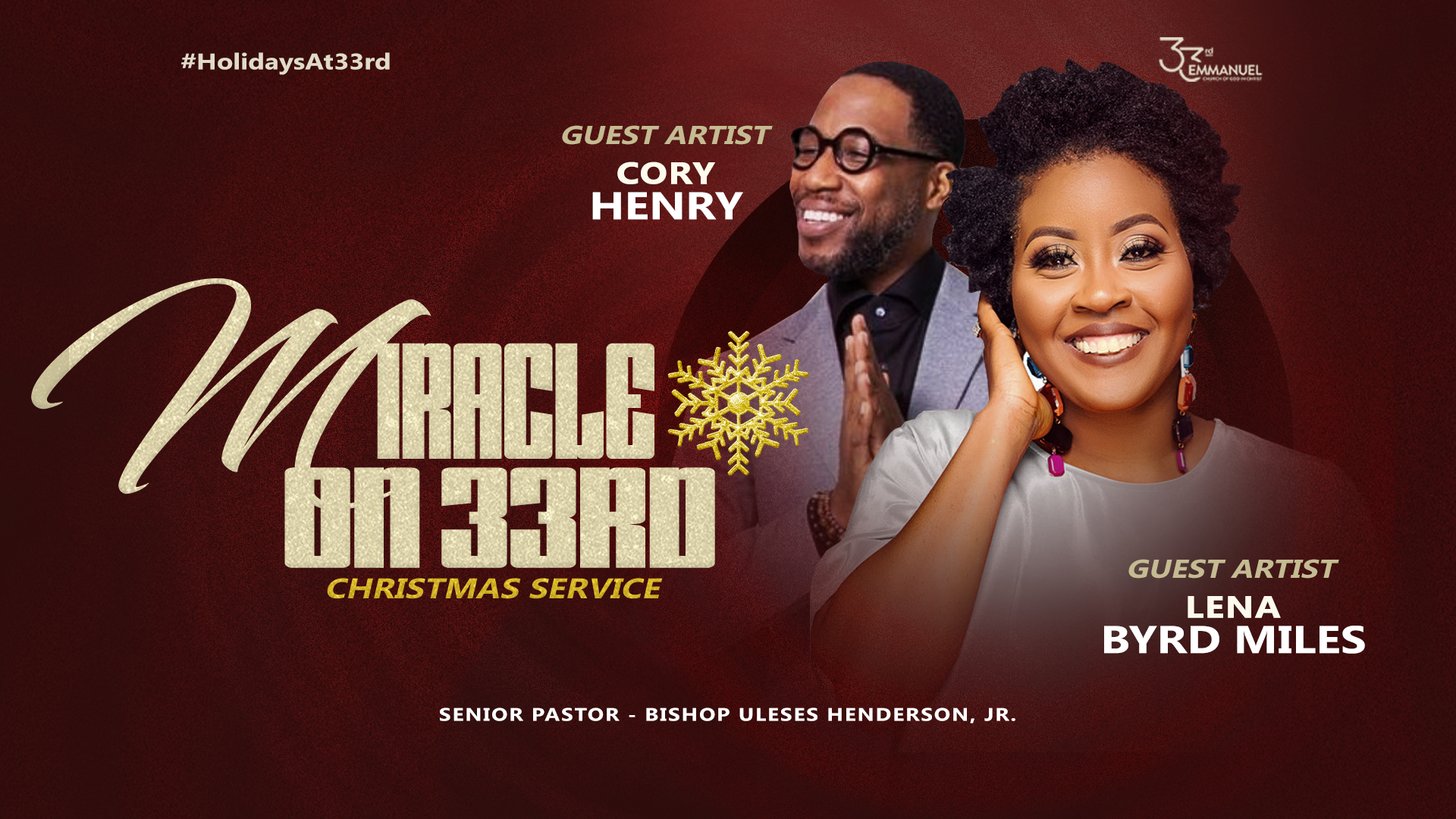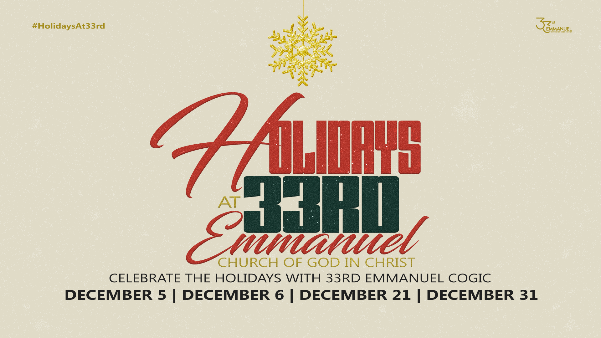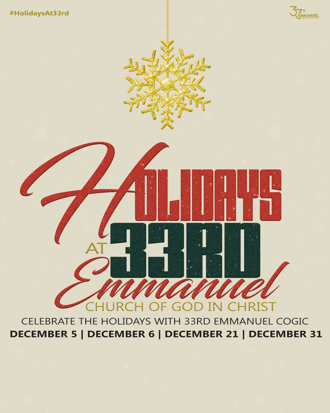 For Holidays at 33rd Emmanuel I developed a Holiday brand and graphics package designed to spotlight each service while still giving every event its own visual presence. The campaign balanced cohesion and individuality, ensuring the overall holiday experience felt unified while each event remained uniquely highlighted.