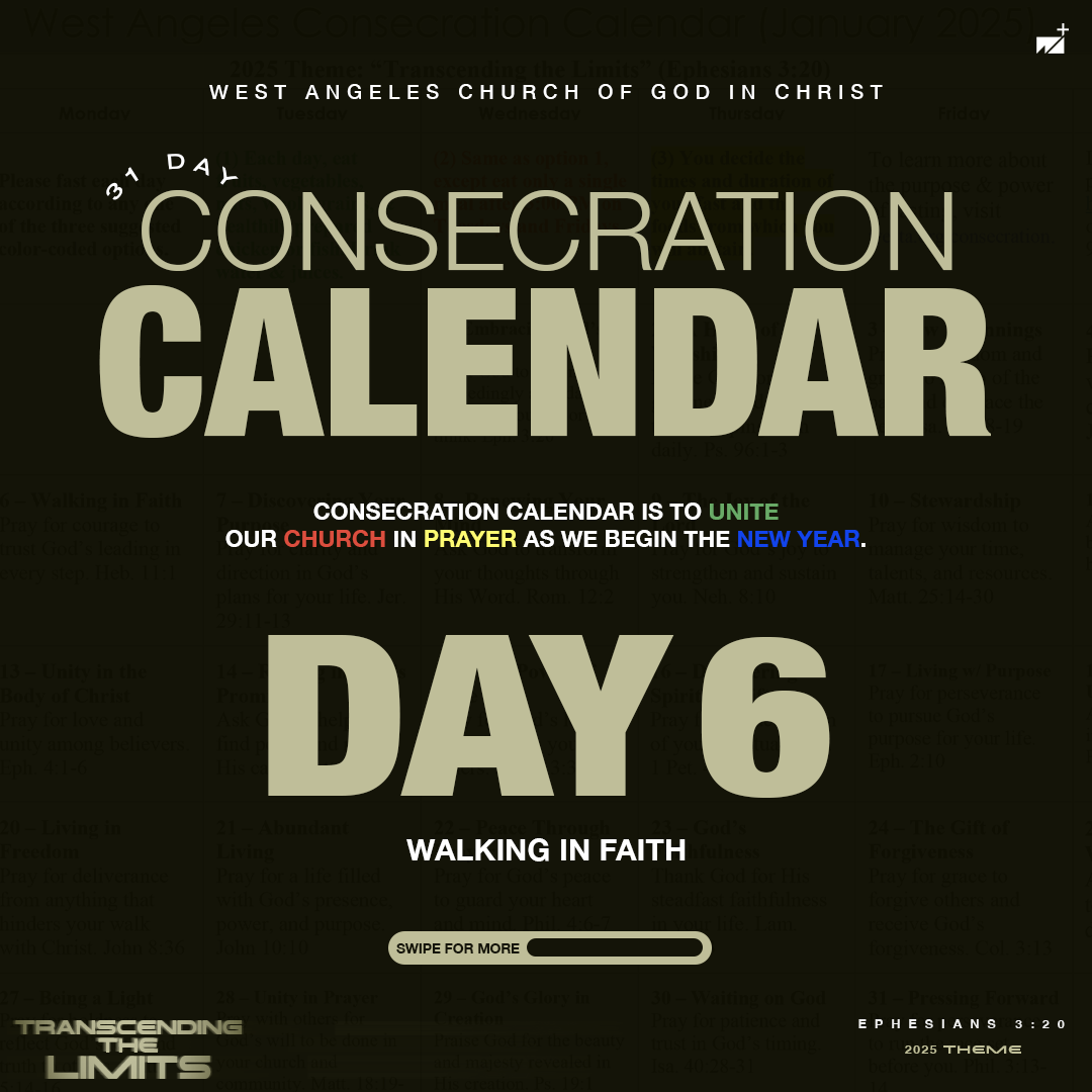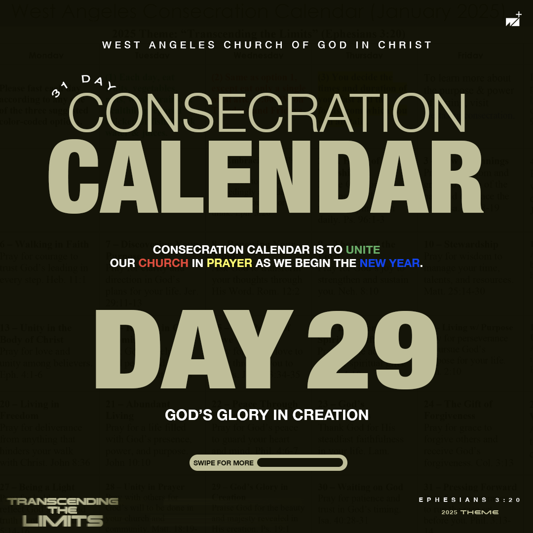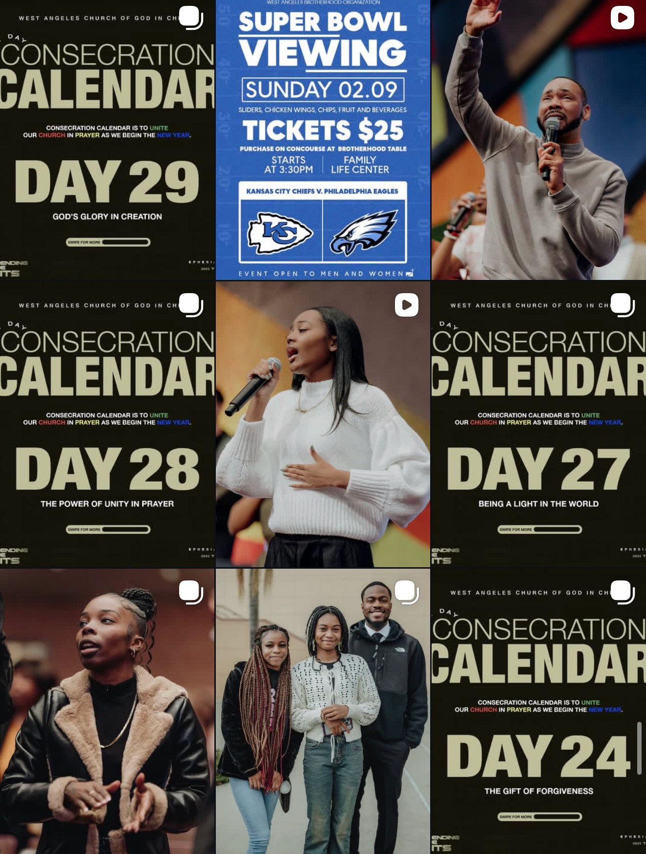 West Angeles Church 31-Day Consecration is a visual branding project developed from the church’s January Consecration Calendar. I designed cohesive, branded visuals aligned with the 2025 theme colors, balancing simplicity with intentional flares of creativity to enhance engagement while maintaining clarity and consistency. Daily posts made by myself on the churches instagram.