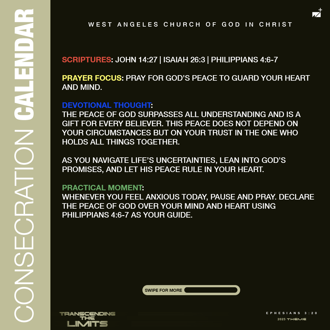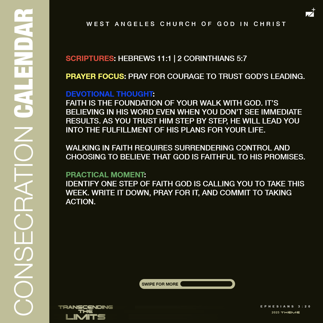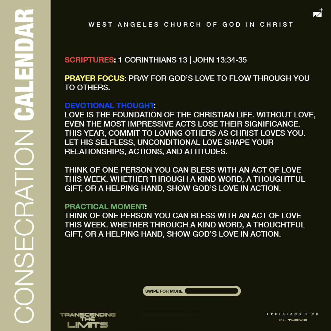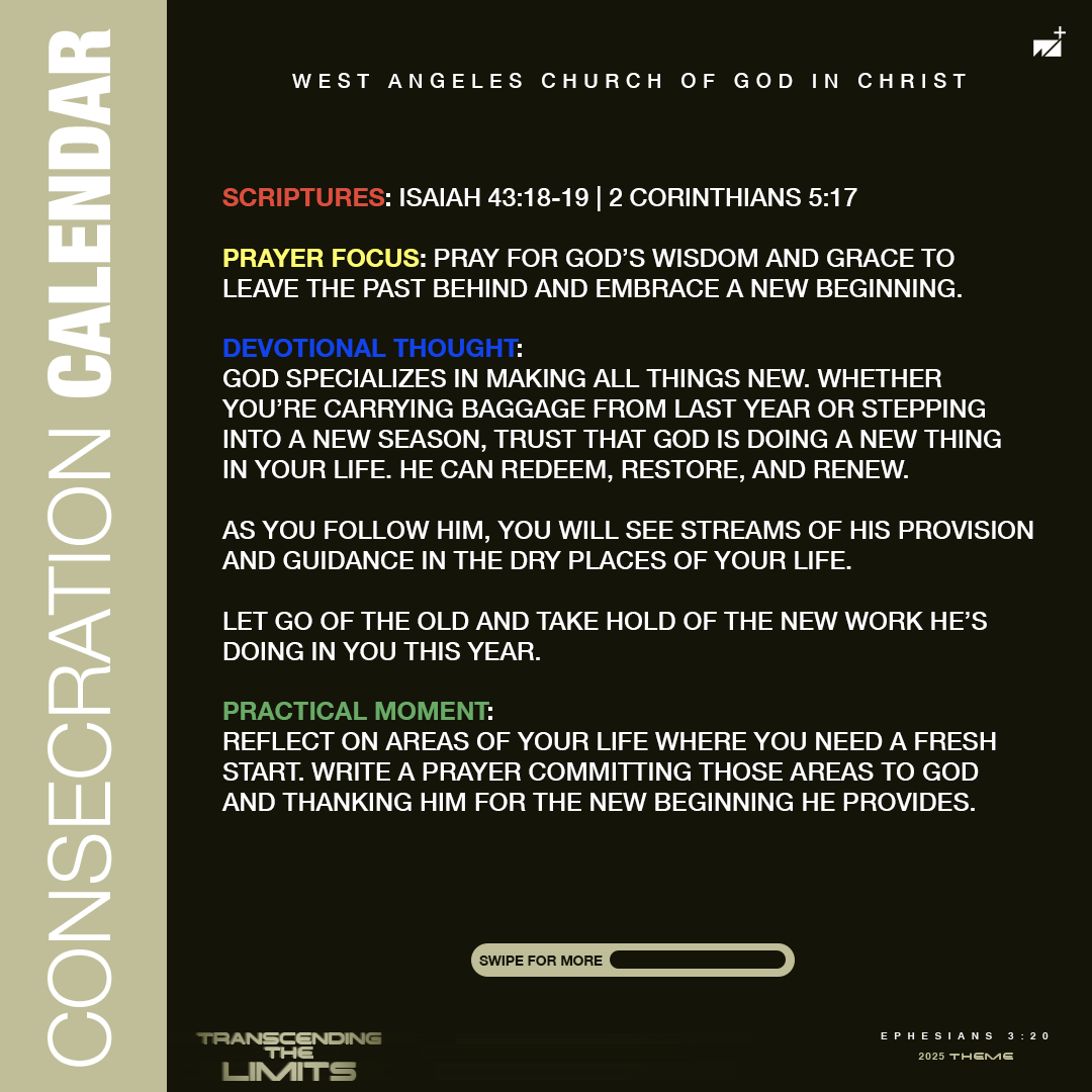 West Angeles Church 31-Day Consecration is a visual branding project developed from the church’s January Consecration Calendar. I designed cohesive, branded visuals aligned with the 2025 theme colors, balancing simplicity with intentional flares of creativity to enhance engagement while maintaining clarity and consistency. Daily posts made by myself on the churches instagram.