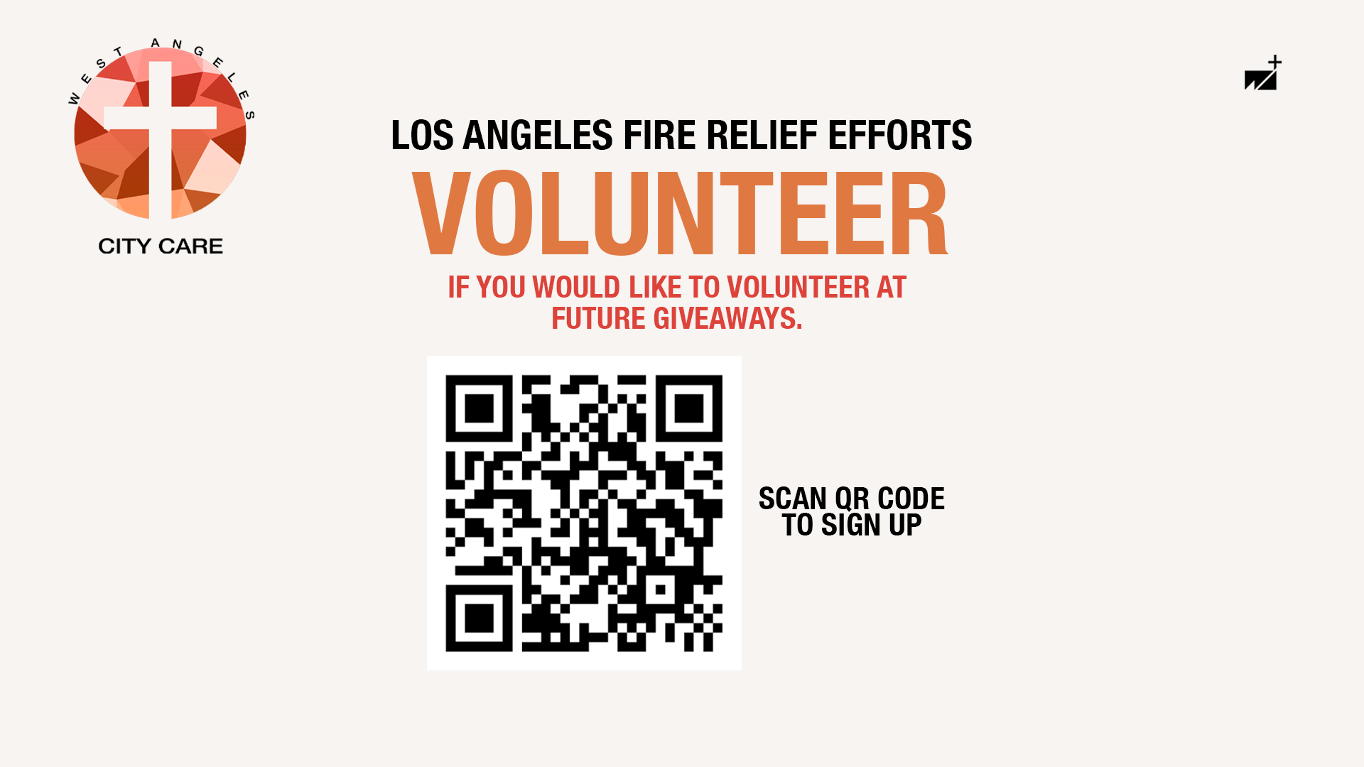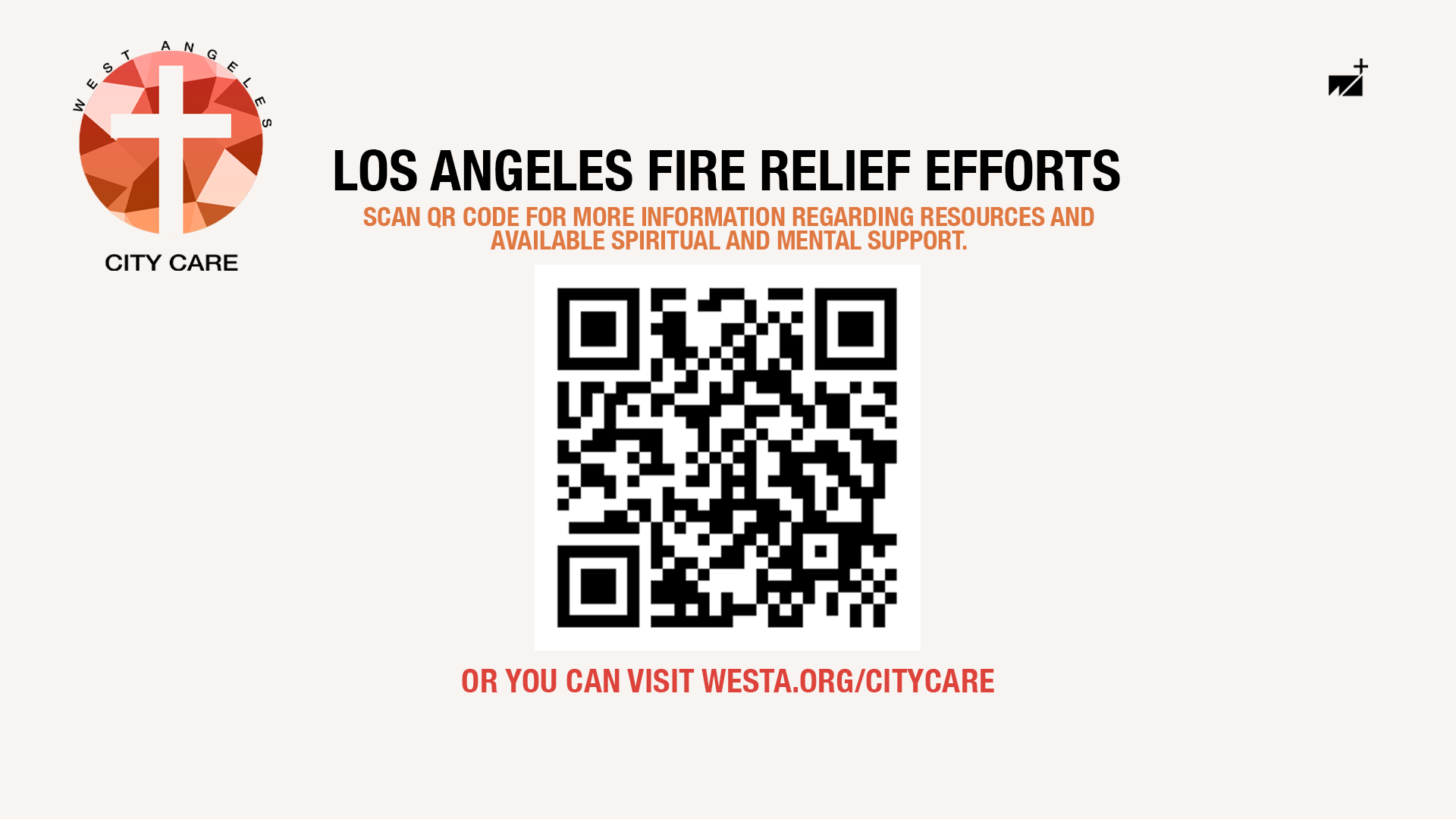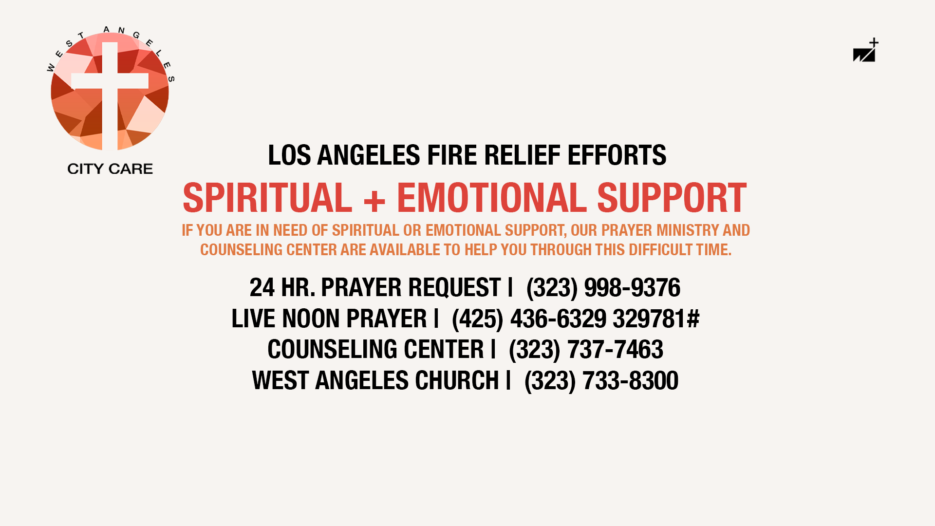 The West Angeles Church City Care Los Angeles Fires Relief effort was approached through a two-step design strategy that balanced brand consistency with visual impact. The first phase focused on the West Angeles City Care logo, which was designed using the church’s established branding standards while incorporating a cross to reflect its faith-centered mission. The second phase focused on the Los Angeles fires relief campaign, where urgency was communicated through the use of red, paired with a soft beige background to maintain compassion. This contrast allowed the messaging to feel immediate yet comforting during a critical time. Throughout both phases, the goal was to honor the church’s simple, recognizable brand while introducing a fresh visual direction that resonated with members and engaged viewers across online platforms.